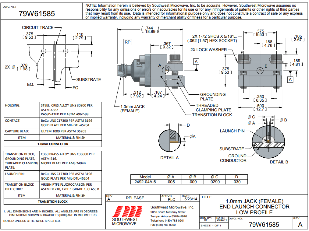 引腳/電物料口徑:0.005 / 0.0290