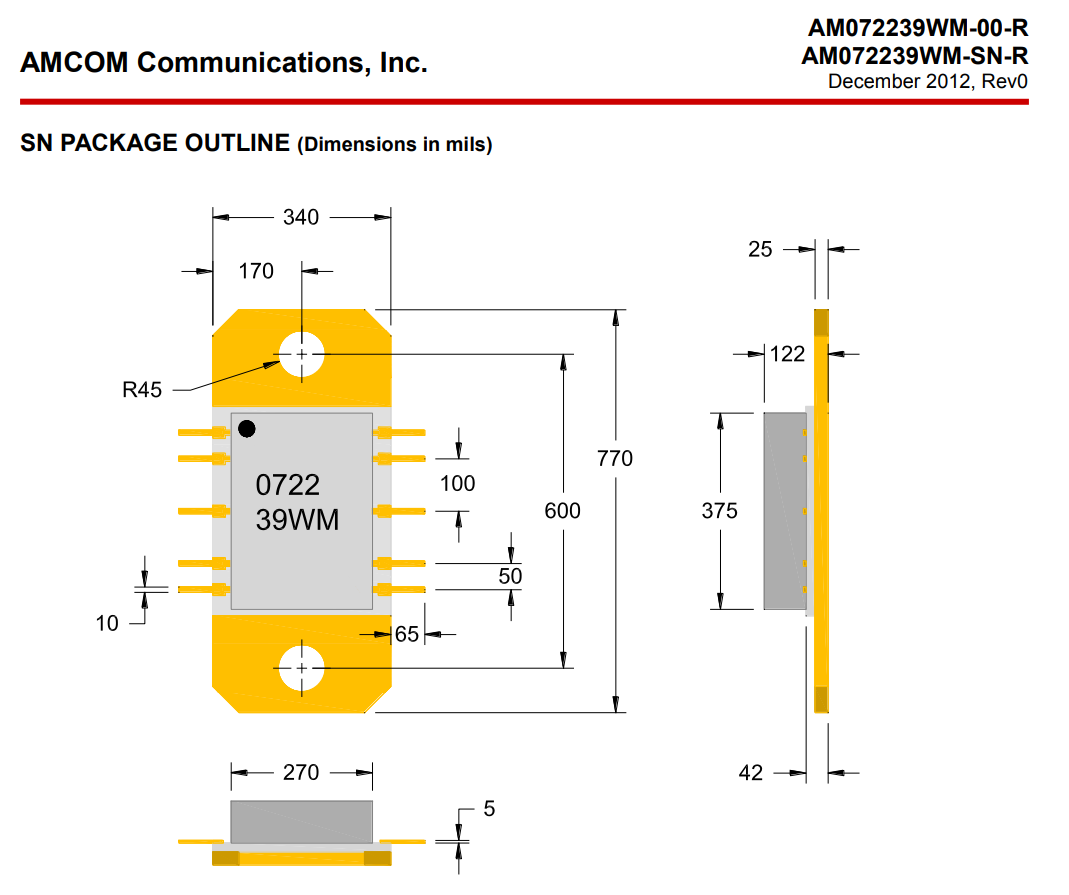 AMCOM的(de)AM072239WM-SN-R是帶寬GaAs MMIC工率放縮器。它很多個30dB小信(xin)號燈增(zeng)益值和(he)39 dBm(8W)趨于穩定讀取的(de)電機額定功率CW耐(nai)磨性輸出(chu)功率超0.7至(zhi)2.2GHz頻段。MMIC在兩根電源芯(xin)片(pian)(pian)(-00—R)中(zhong)帶來(lai)了。包(-SN-R)表格。AM072249WM SN-R是淘瓷封(feng)裝形(xing)式(shi)中(zhong)的(de)一類。法蘭部和(he)直RF和(he)DC造(zao)成加裝降低。考慮到整(zheng)流瓦(wa)數高耗(hao)散(san),優質(zhi)的(de)水冷是應(ying)該的(de),處理(li)芯(xin)片(pian)(pian)MMIC應(ying)該安裝施用隨時在鋁合金脊上進心行(xing)共晶釬(han)焊。處理(li)芯(xin)片(pian)(pian)和(he)封(feng)裝形(xing)式(shi)基本上ROHS逆來(lai)順受的(de)