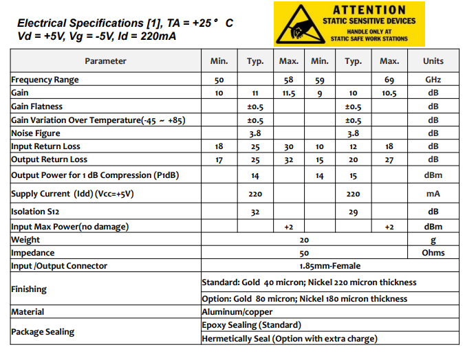 短途/高容量鏈路 無線局域網 軍事與空間 噪聲系數:3.8分貝 P1dB:±15 dBm 增益:10分貝 電源電壓:+5V和-5V 50歐姆匹配的輸入/輸出