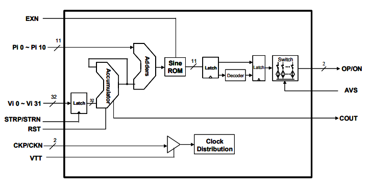 ds855是高速(su)直接(jie)數字頻(pin)(pin)(pin)率(lv)(lv)(lv)合成器(DDS)與一(yi)(yi)個(ge)32位(wei)(wei)頻(pin)(pin)(pin)率(lv)(lv)(lv)調(diao)諧(xie)分辨(bian)率(lv)(lv)(lv),11位(wei)(wei)相位(wei)(wei)調(diao)制(zhi)輸(shu)入(ru)和11位(wei)(wei)的(de)(de)幅度(du)分辨(bian)率(lv)(lv)(lv)。第一(yi)(yi)奈奎(kui)斯特帶中的(de)(de)正(zheng)弦波(bo)可(ke)以(yi)產生到(dao)接(jie)近1.2 GHz(在2.5GHz時(shi)鐘(zhong)(zhong)速(su)率(lv)(lv)(lv))。初始相位(wei)(wei)可(ke)以(yi)重置(zhi)為零度(du)的(de)(de)正(zheng)弦波(bo)開始。該芯片(pian)有一(yi)(yi)對互補輸(shu)出50Ω后(hou)端。輸(shu)出波(bo)形的(de)(de)頻(pin)(pin)(pin)率(lv)(lv)(lv)可(ke)由(you)三十(shi)二(er)個(ge)頻(pin)(pin)(pin)率(lv)(lv)(lv)控制(zhi)位(wei)(wei)VIIO 0~VIY31控制(zhi)。輸(shu)出波(bo)形的(de)(de)相位(wei)(wei)可(ke)以(yi)由(you)11位(wei)(wei)PI00~PIY10相位(wei)(wei)調(diao)制(zhi)輸(shu)入(ru)進行調(diao)制(zhi)。的(de)(de)ds855接(jie)受(shou)互補時(shi)鐘(zhong)(zhong)輸(shu)入(ru)或(huo)(huo)單端時(shi)鐘(zhong)(zhong)輸(shu)入(ru)的(de)(de)特點50?片(pian)回到(dao)終端用戶定(ding)義的(de)(de)閾值(zhi)。頻(pin)(pin)(pin)率(lv)(lv)(lv)分辨(bian)率(lv)(lv)(lv)位(wei)(wei)接(jie)受(shou)TTL或(huo)(huo)CMOS輸(shu)入(ru)電(dian)平。只需(xu)要一(yi)(yi)個(ge)5V的(de)(de)電(dian)源。